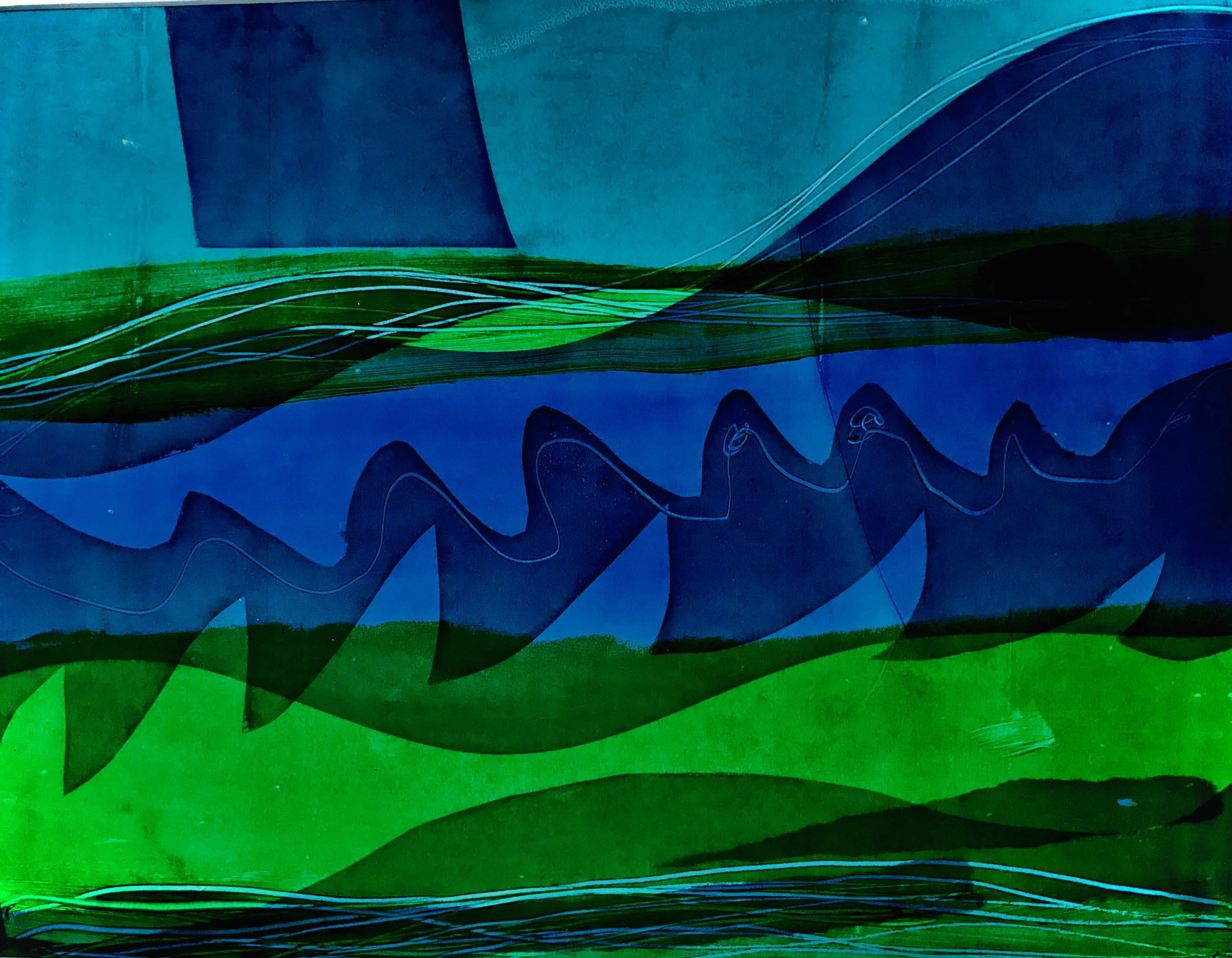 Her abstract work uses bold shapes and flat colour with strong pattern making inclinations. She plays with negative space, juxtaposition and overlapping of colour, scraping, incised lines, frottage, experimental brushstrokes, and the mixing of paint on the canvas. Her jewel like colours and strong contrasts in tonal quality communicates a sense of depth. There is a liveliness to them, with the compositions being beautifully balanced; they are complete, with colour and tone portraying a level of complexity.